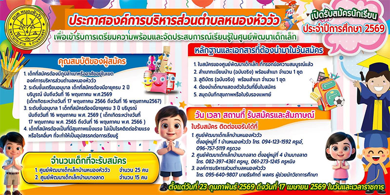 เปิดรับสมัครนักเรียน ศูนย์พัฒนาเด็กเล็กตำบลหนองหัววัว
